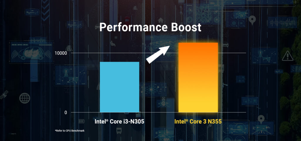針對較重的作業負載,Intel® Core™ 3 處理器 N355 提供了卓越的價值,其最高渦輪頻率可達 3.9GHz,GPU 時脈高達 1.35GHz。與 Alder Lake Core™ i3-N305 相比,Twin Lake 八核心 CPU 在保持相同高效能功耗比的同時,多執行緒效能提升了 10%。這種效能增長確保了在不增加能耗的情況下,獲得更高的效率與價值。
