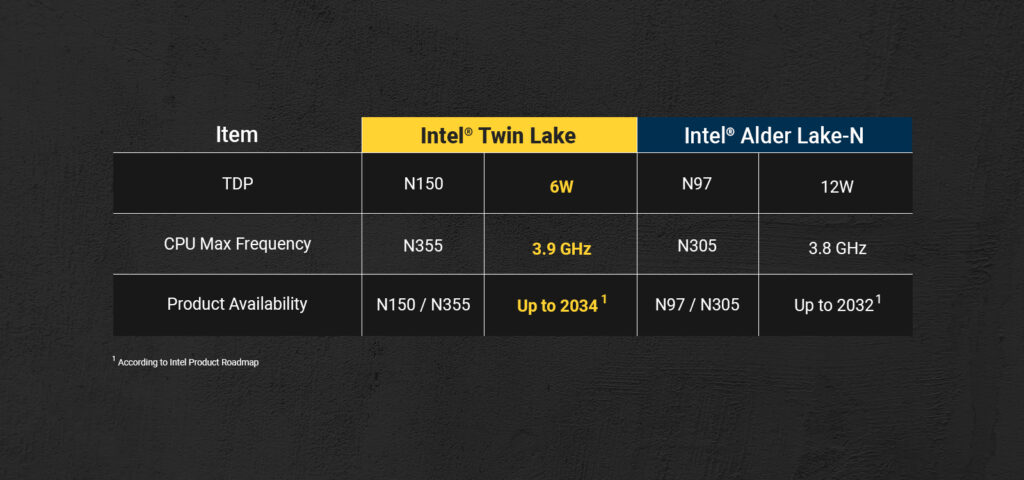Twin Lake 系列於 2025 年初發佈(即 Alder Lake-N 問世兩年後),產品生命週期支援將持續至 2034 年。憑藉長期的供貨穩定性與一致的技術支援,這款 Intel 低功耗 CPU 系列的進化版,特別適用於要求系統長效運作、持續供應與可靠服務的嵌入式及工業應用。